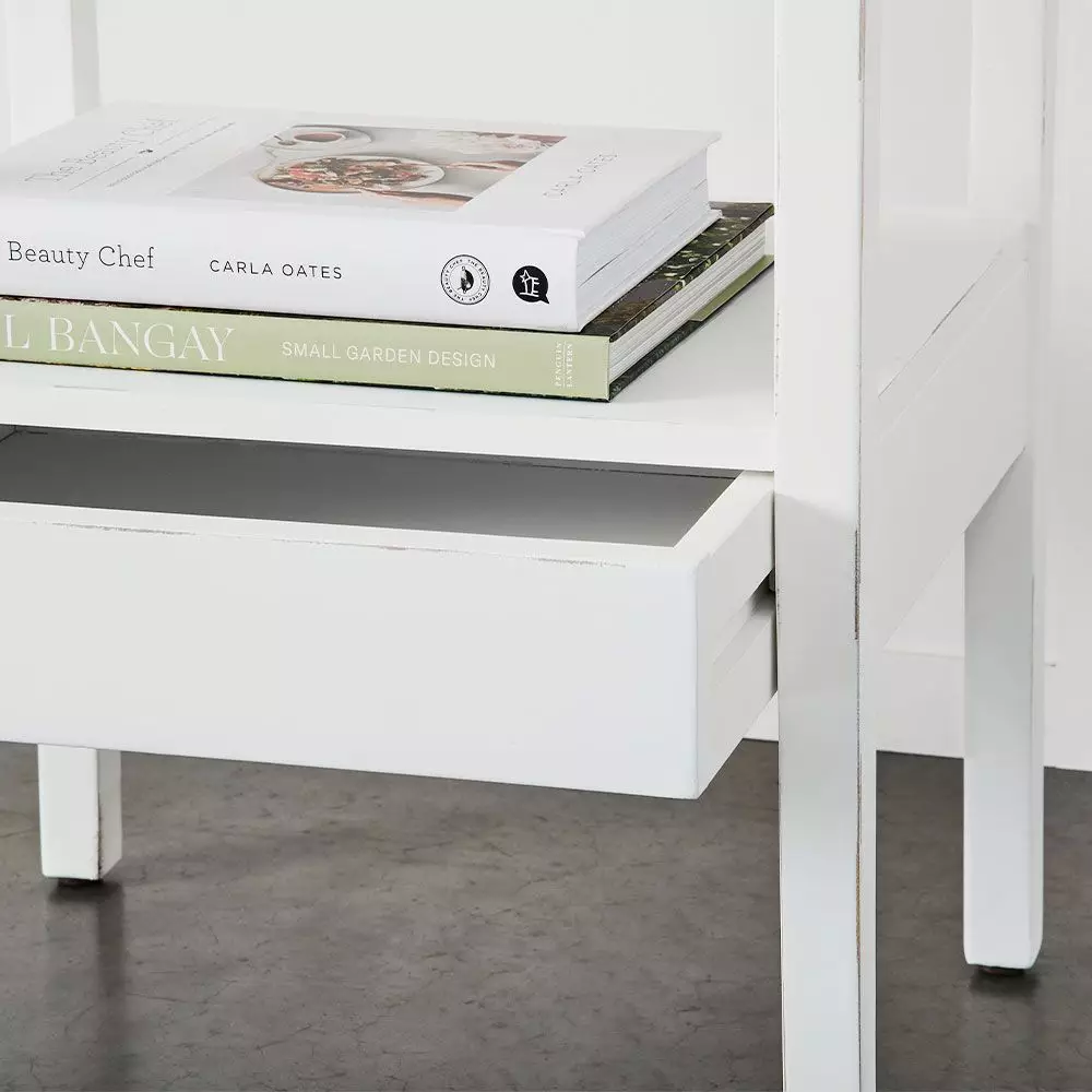 A sweet, streamlined bedside table crafted from poplar and painted white with a slightly distressed look. The tray top prevents things falling off and there’s a handy, discreet drawer to keep the bedside free from clutter.