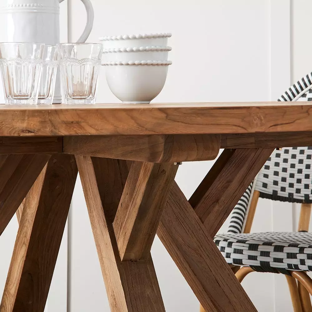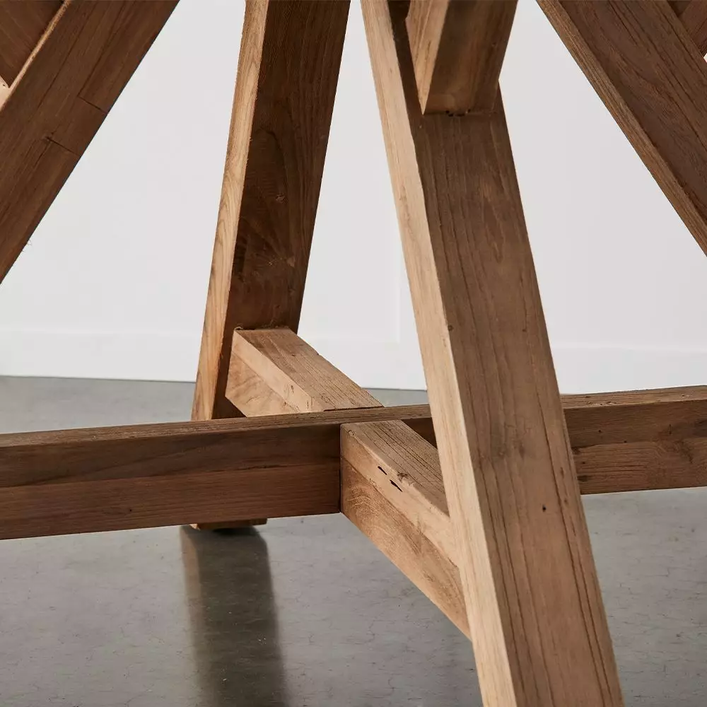 A strong, sturdy table with the detailed construction of the legs being the only decoration needed. Beautifully crafted from reclaimed teak – the timber does all the talking. Leave it for the elements to weather it to a soft grey colour or protect it with teak oil to preserve the current hue.