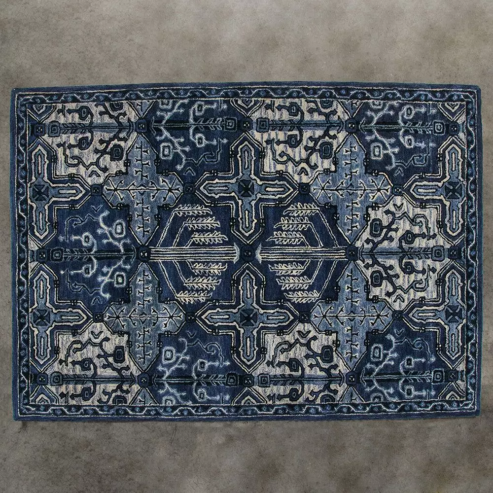 A hand woven 100% wool rug that combines indigo tones in a loop textured weave. A lovely rug for grounding a room.
