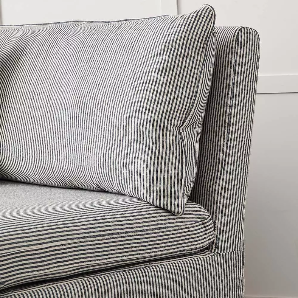 Dining goes coastal with our Emery slip covered dining bench in a blue and white stripe. The comfortable bench is a perfect for casual or formal dining and a great way to fit more people around the table. It can also double for extra seating in the living room.