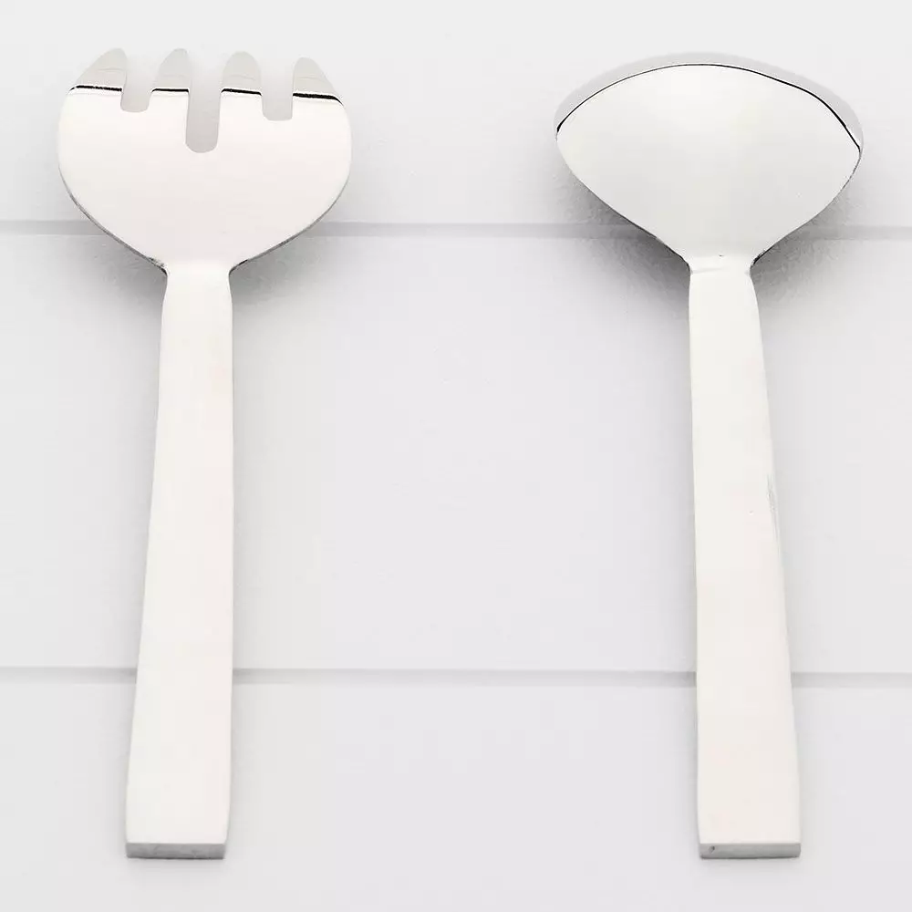 A classic set of salad servers combining stainless steel with food safe enamel.
