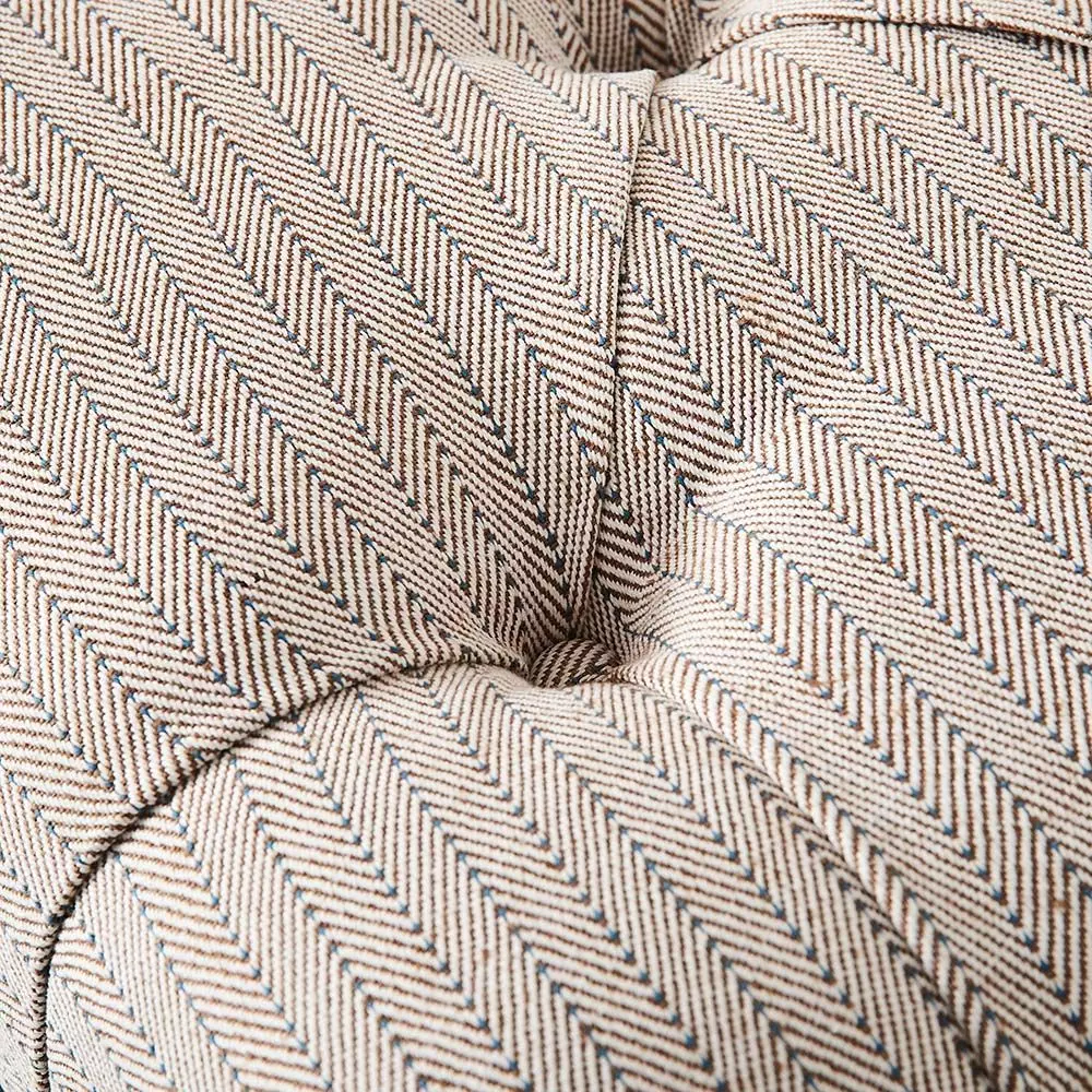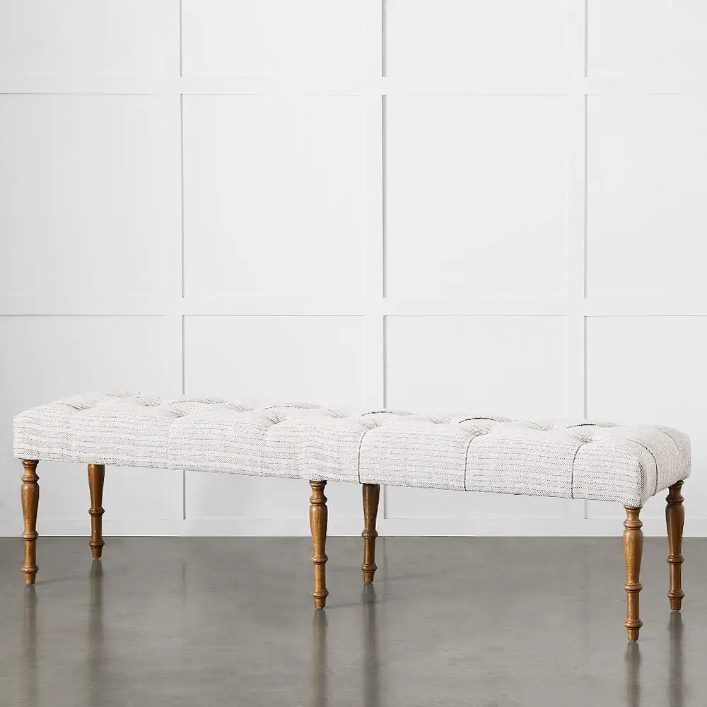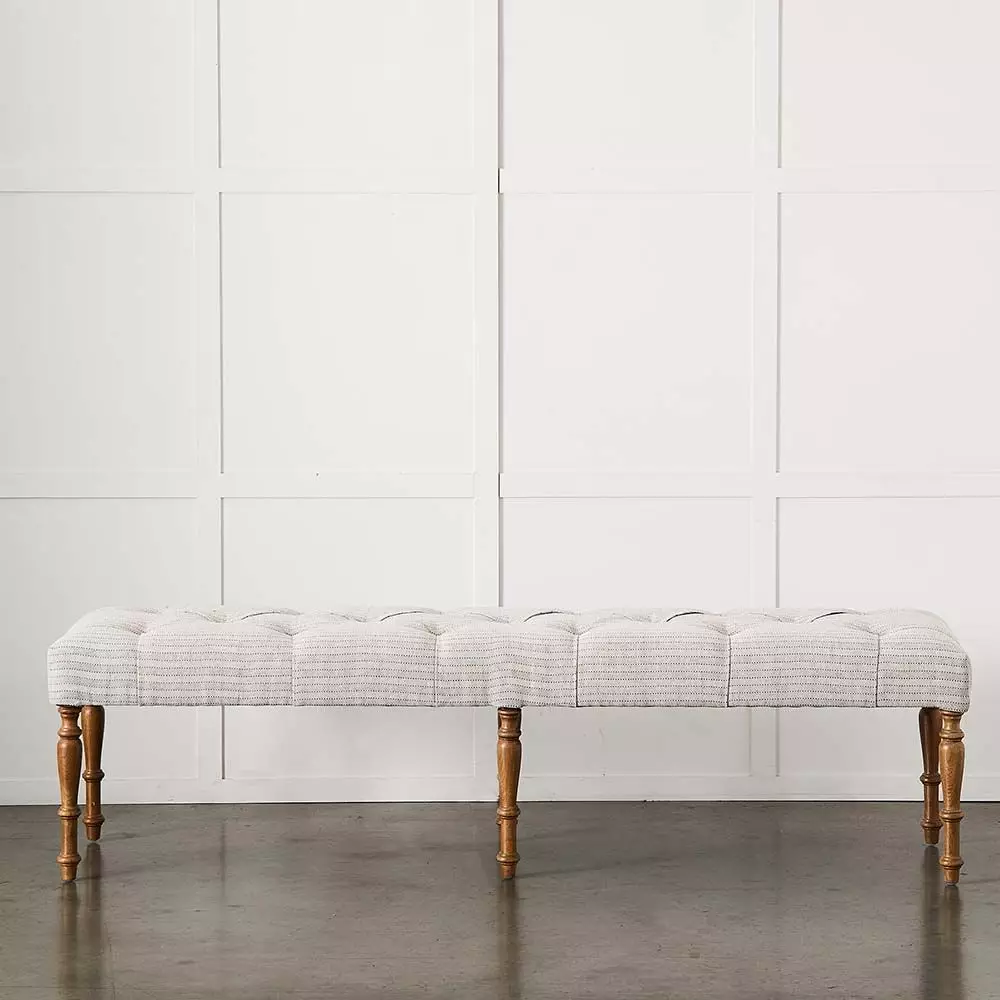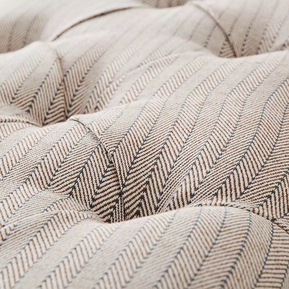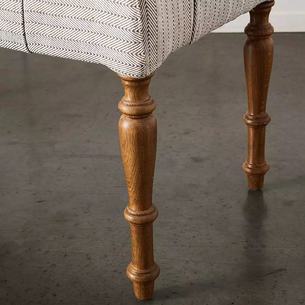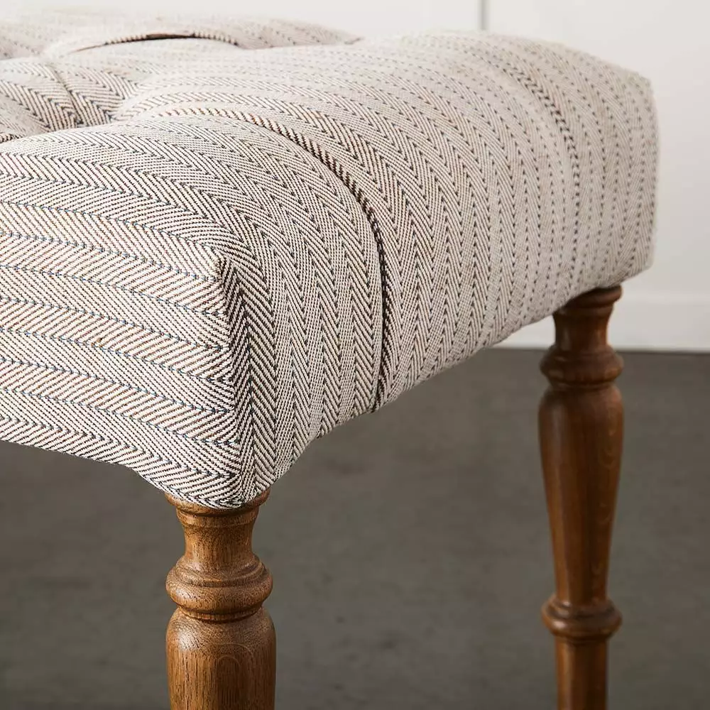 The Hamlet bench is so versatile it could be the perfect piece of furniture. Use it as bench seating at the dining table, in the living room as extra seating or as an ottoman at the end of the bed. Upholstered in a lovely herringbone cotton/jute mix fabric in taupe with a blue accent stripe and complement the elegant turned oak legs that complete the bench.