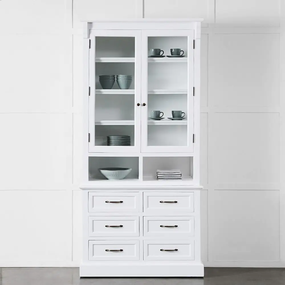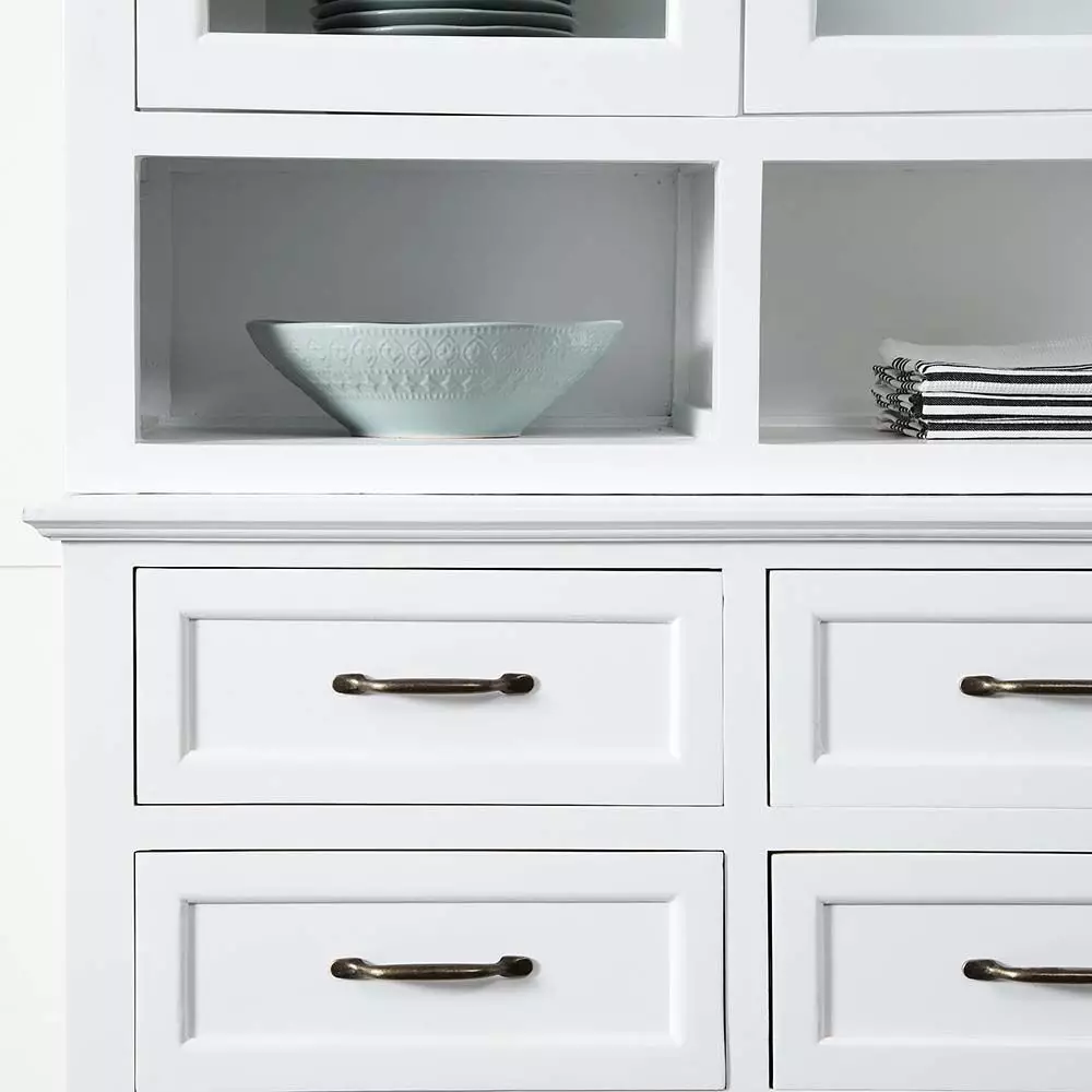 The Hopetoun Buffet & Hutch although compact has all storage options covered. Shelving behind glass doors proudly displays items but keeps them protected from dust, 6 handy drawers and a divided open shelf for ease of access. Finished with a crisp white, painted finish, this piece will look perfect in the kitchen or dining room.