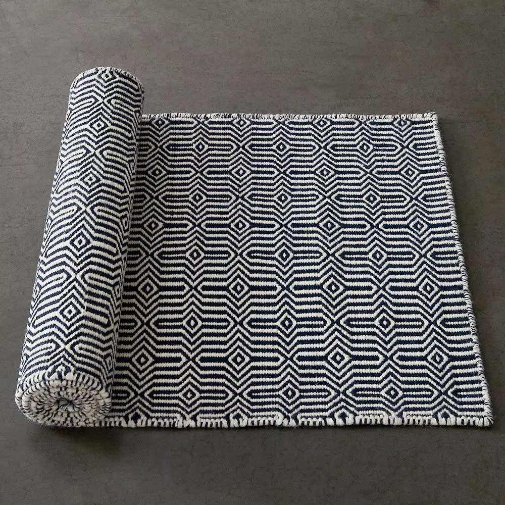 A mix of natural and dyed yarns woven into a contemporary geometric pattern in classic navy and ivory. This durable flatweave runner is made from 100% wool, ideal for high traffic areas and family living.