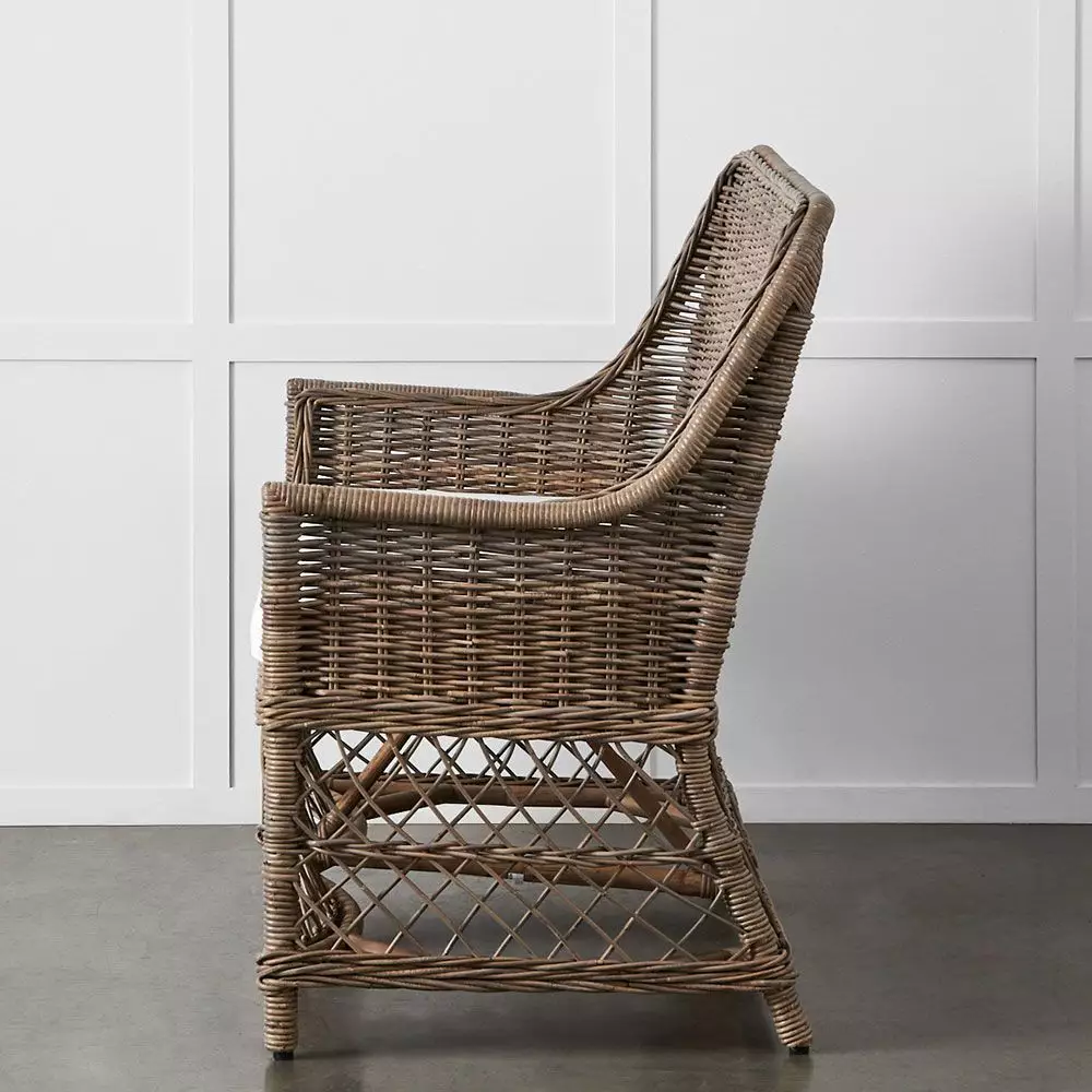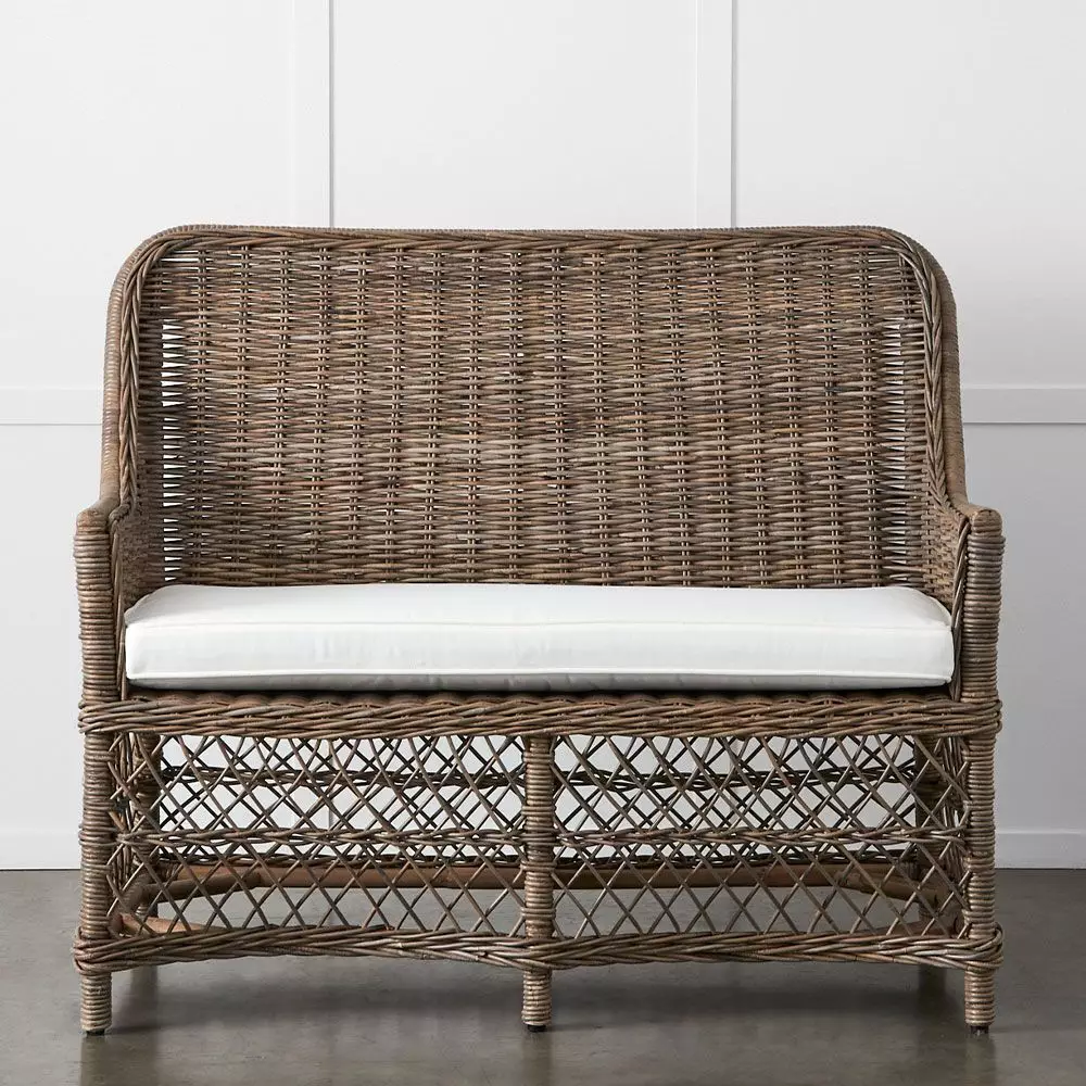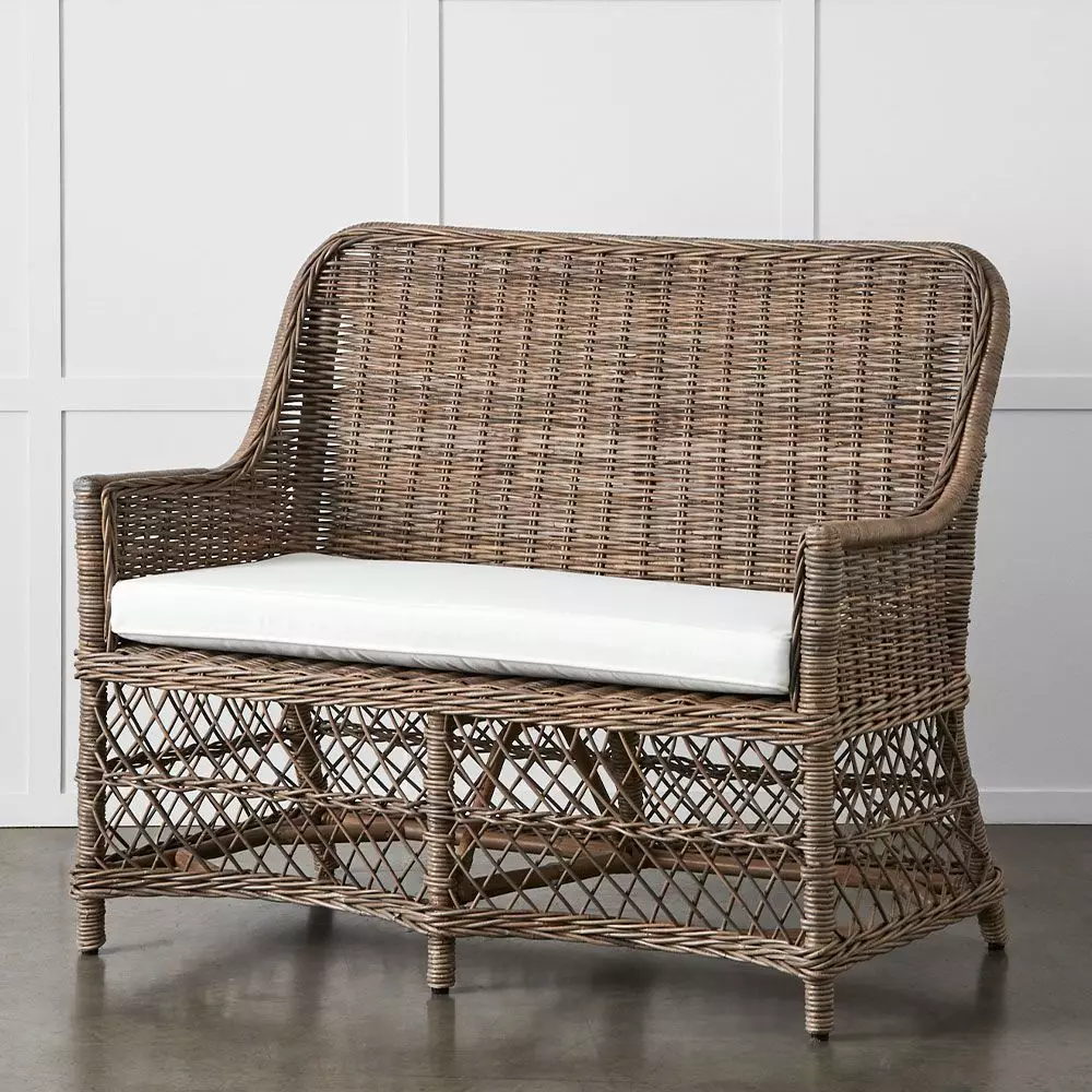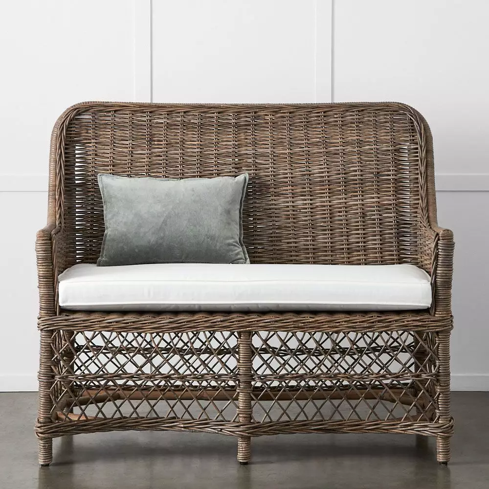 This fabulous 2-seater verandah chair doubles as a sofa. It’s beautifully woven in rattan and has a long cotton canvas covered cushion for added comfort. The subtle detailed weaving around the base of the chair adds to its beauty.