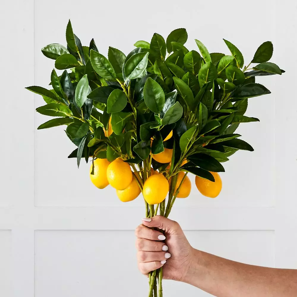 Keep a touch of bright yellow on the kitchen bench with some lemon stems – 2 perfect lemons and some leaves on each.