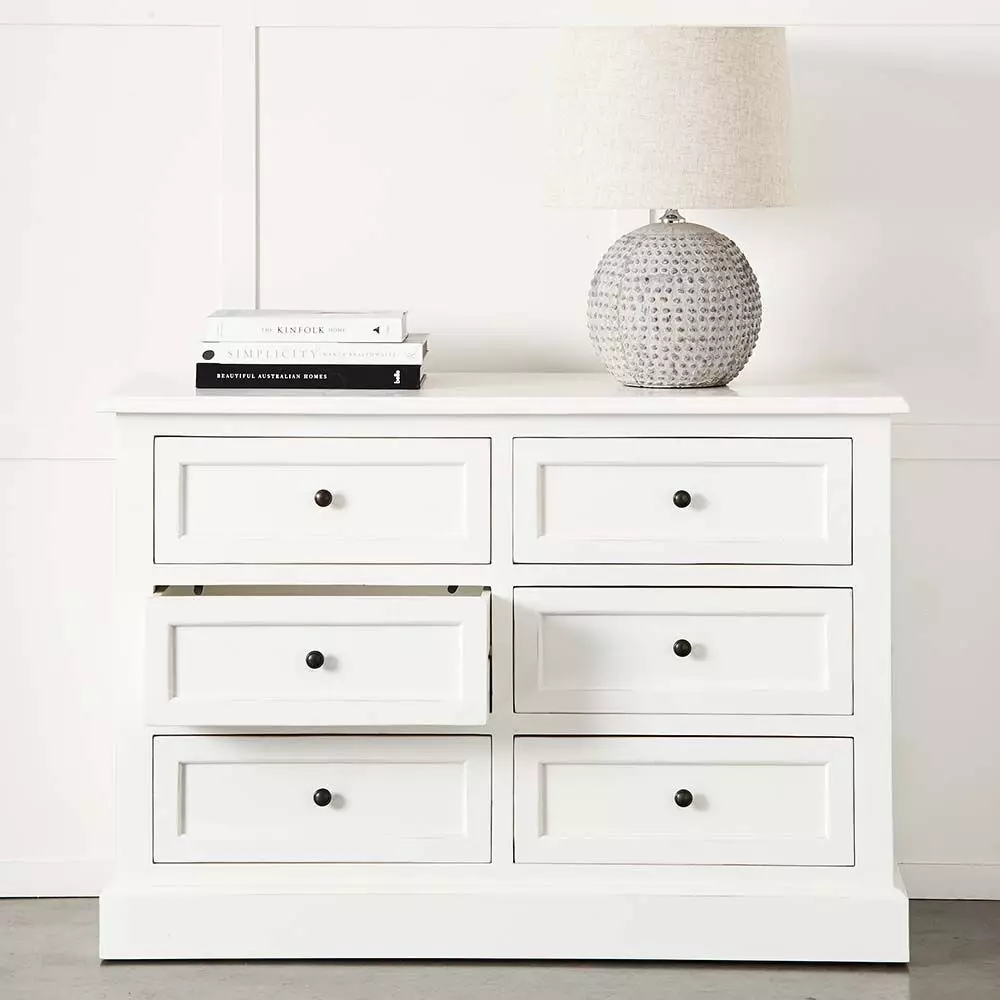 The Logan is an elegant chest of drawers constructed from polar. The neat zinc alloy drawer pulls are offset against the crisp white water-based paint. Six handy drawers make this piece of furniture the perfect choice in the bedroom, dining room or living room. An extremely versatile piece of furniture that can adapt to various uses.