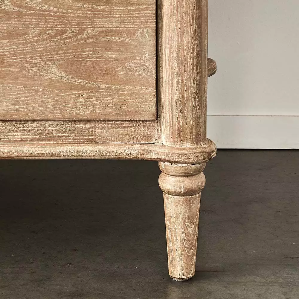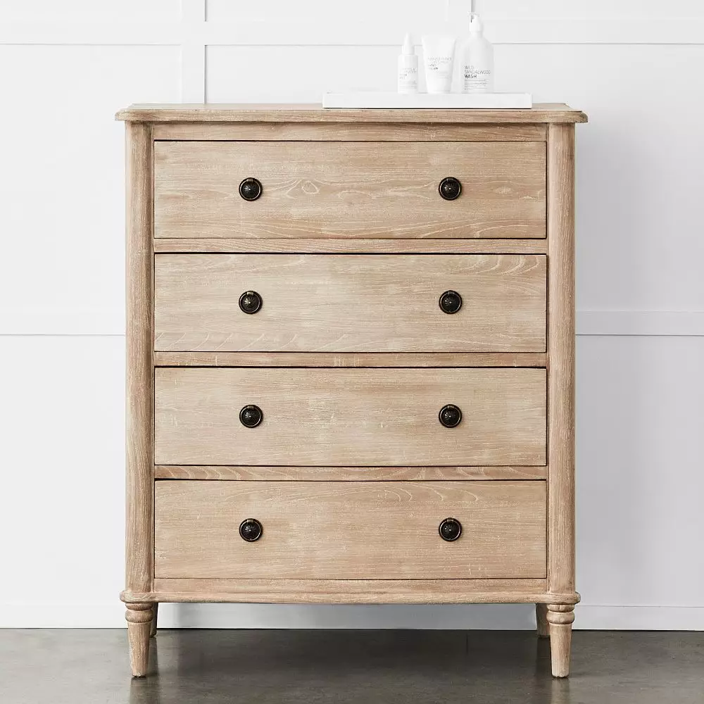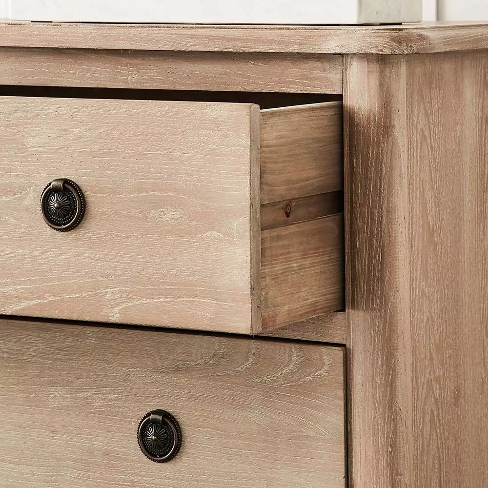 The Montrose has a curved front and slightly rounded edges on the top of the tall boy, lovely detailing on the legs and elegant metal ring pulls on the four drawers – all combine to create a charming piece of furniture. Crafted from reclaimed elm and fir.