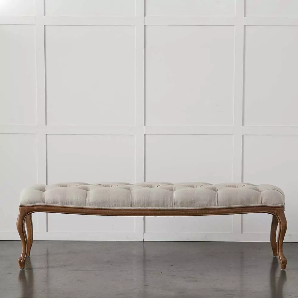 The Olivia bench is a beautiful deep buttoned bench upholstered in natural linen with the beautiful frame and turned legs in oak. Perfect for use under a window or at the end of a bed. Fold up a throw and pop on a cushion to add a new dimension to the bedroom. It’s the perfect partner for any of our natural linen bedheads.