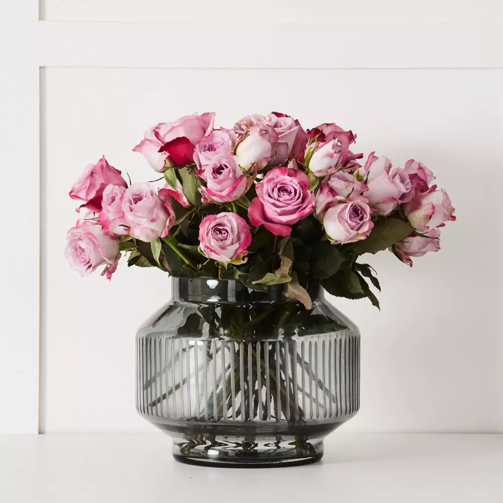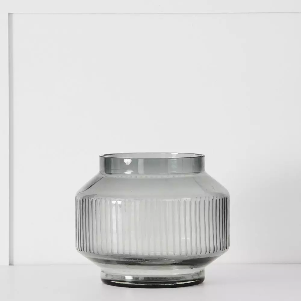 This low round ribbed vase is perfect for all sorts of flowers and foliage. The soft grey colour of the glass will enhance your floral display.