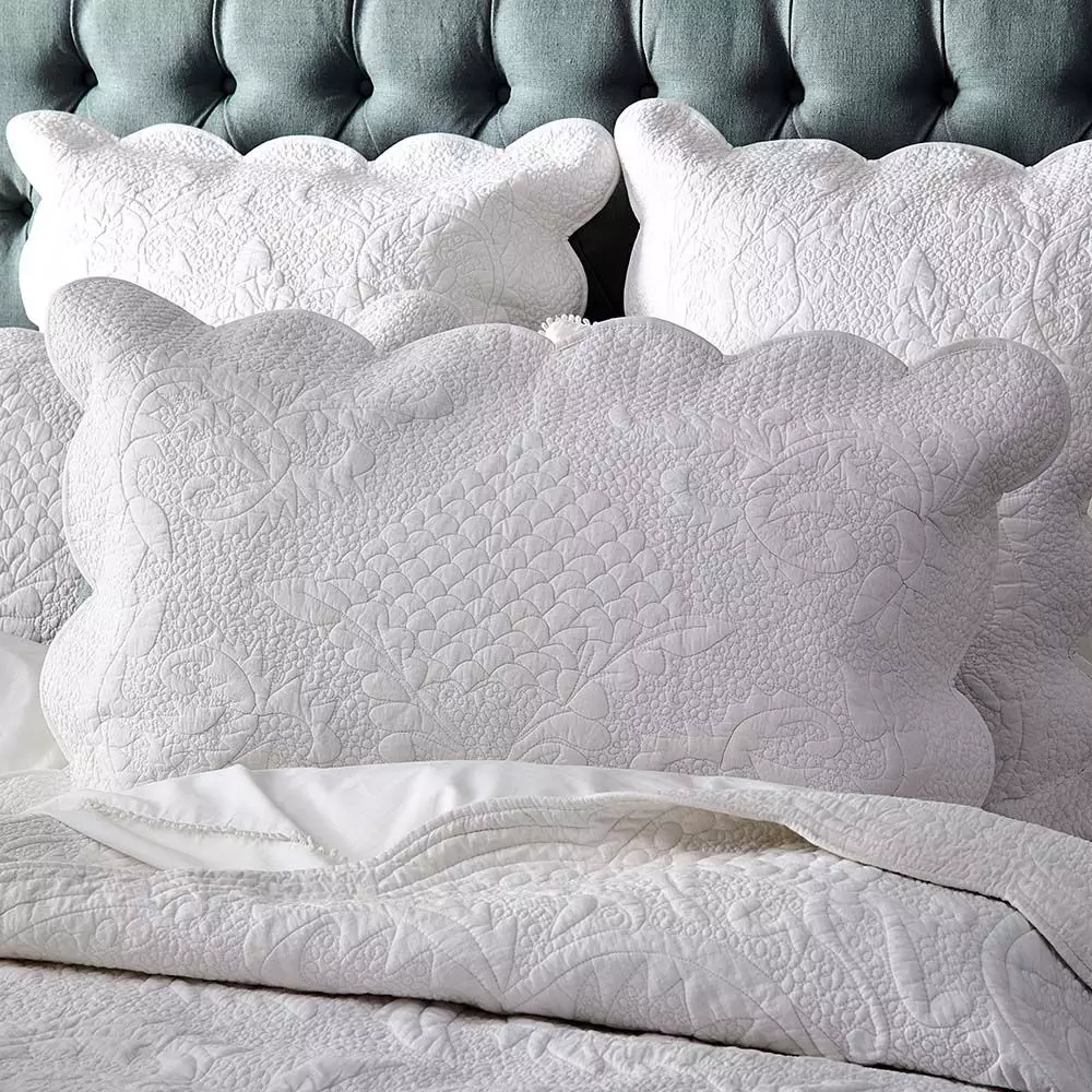 The Pembroke is a beautifully stitched 100% cotton sham, quilted in the tradition French boutis manner with cotton filling between the two fabric layers. It is quilted in an intricate pattern that adds a lot of texture and is completed with a delicate scalloped edge. White is always a beautiful choice for the bedroom and easily pairs with any other colour – or for a pristine look – keep it all white. The reverse of the sham is a fine, plain white cotton finished with ties.