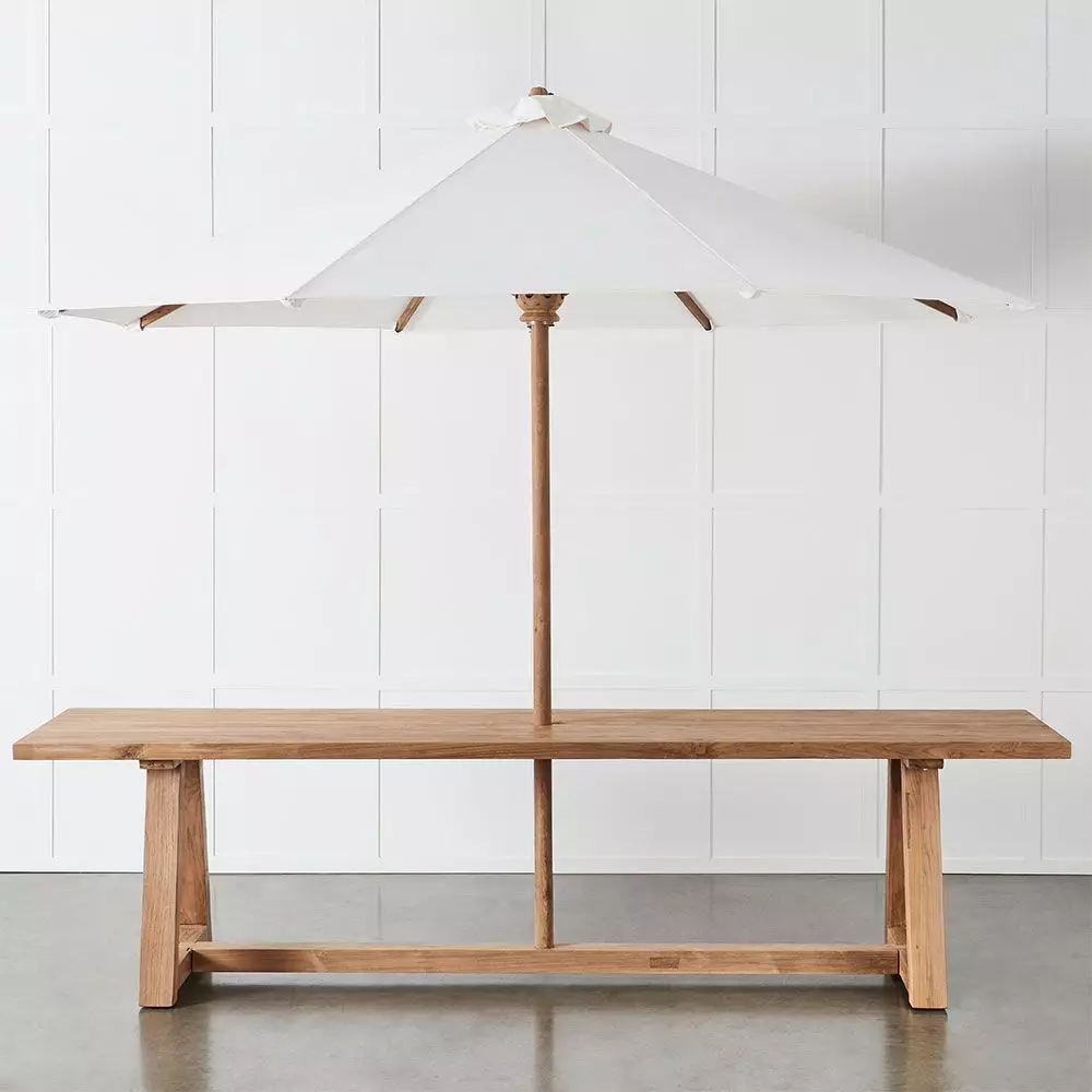 The elegant Porto Table is crafted from reclaimed teak with trestle style legs and a stretcher base. There is an umbrella hole in the centre of the table, perfect for holding our fabulous Paradiso umbrella and to keep it secure, there is also a hole in the stretcher base.