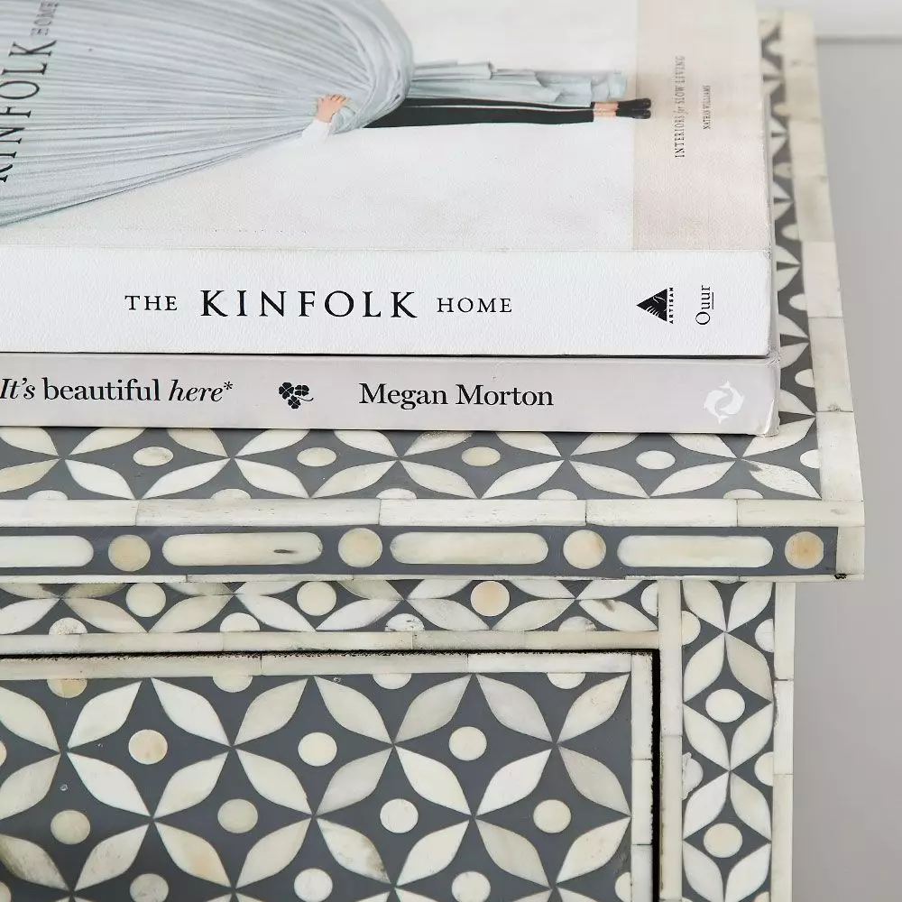 A beautiful inlaid bedside table crafted from ethically sourced bone and coloured resin. The craftsmanship is superb and a beautiful example of skills, handed down through the generations. Natural variations in colour of the bone and resin are normal and the pattern may differ between artisans. It’s not only beautiful, but also practical with three large drawers.