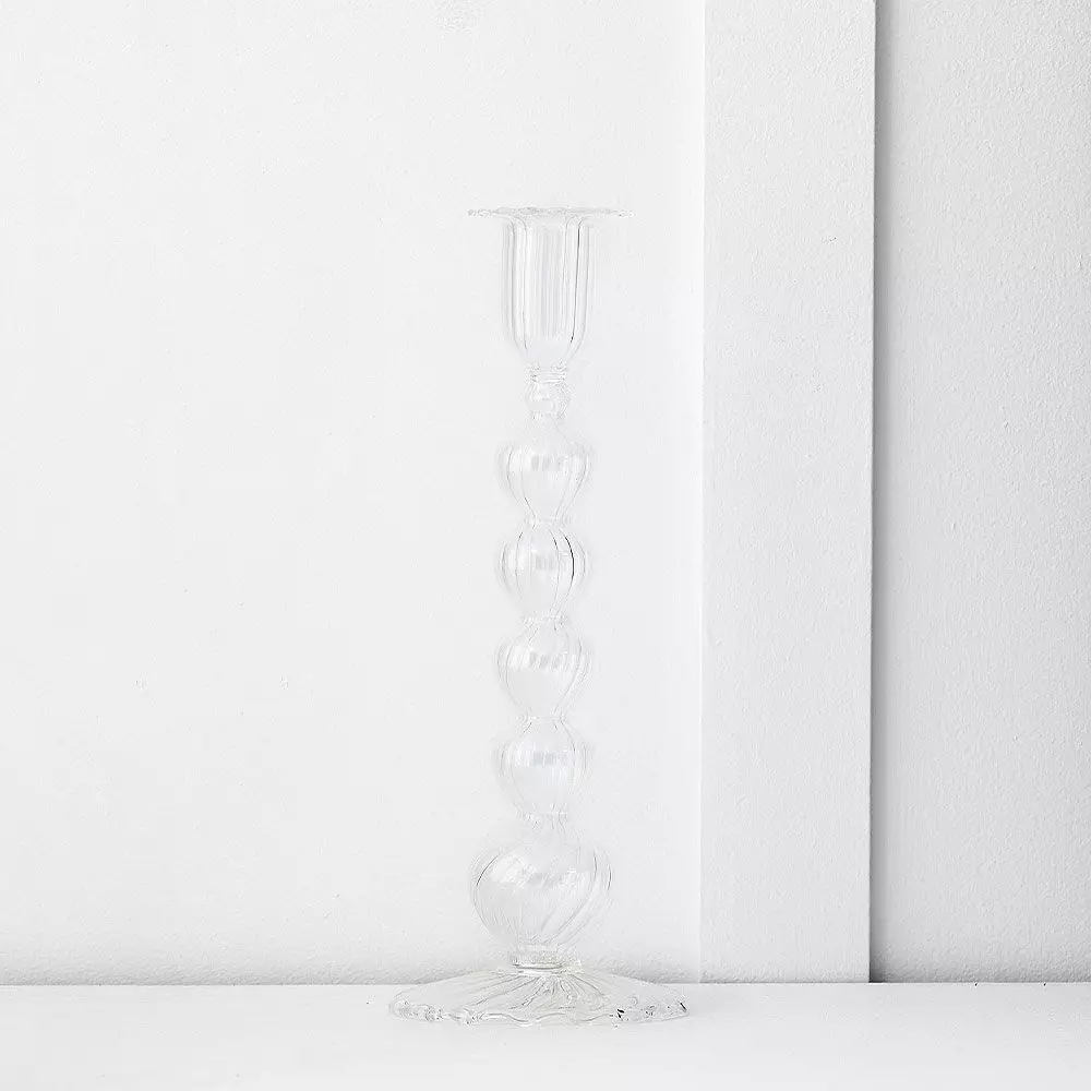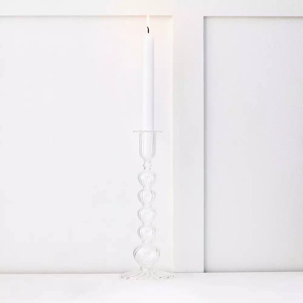 A tall, delicate clear glass candle holder. The beautiful shapes are highlgihted by the fluted glass. Mix it with some other candle holders in different shapes and heights and you’ll create a dazzling display.