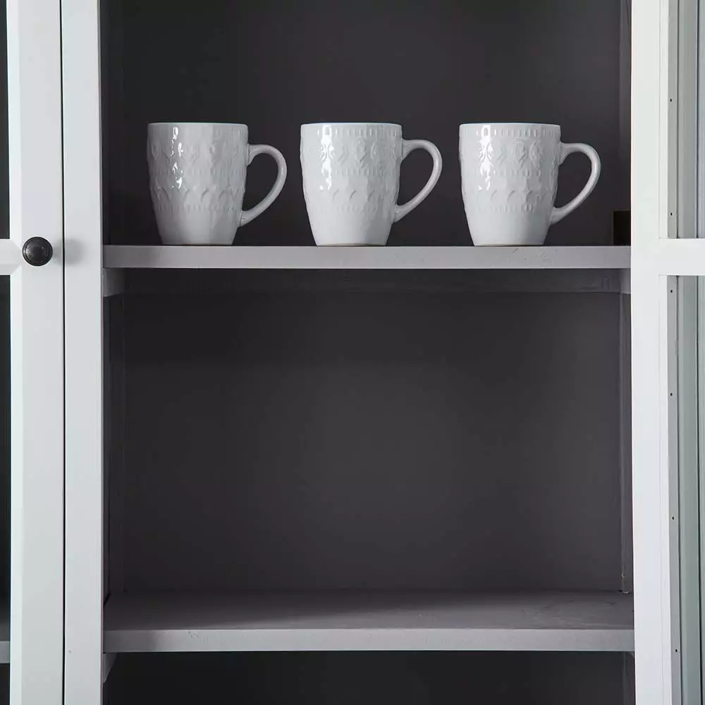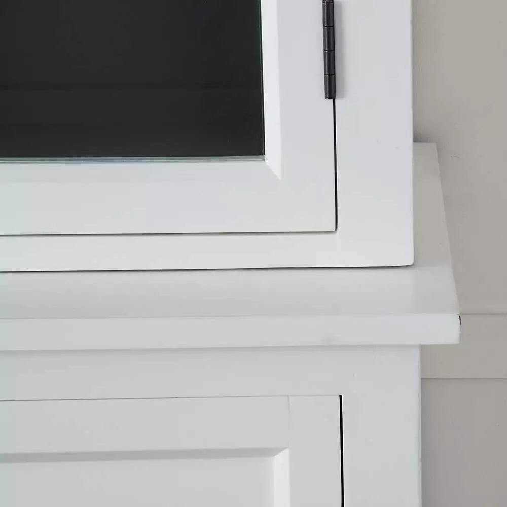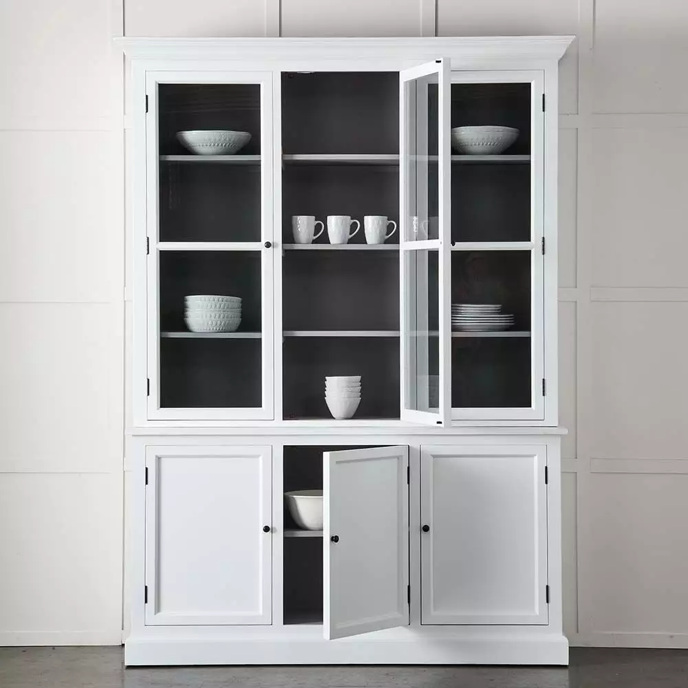 Crafted from poplar wood and painted a crisp white on the exterior and a grey on the interior, to perfectly showcase crockery and glasses.