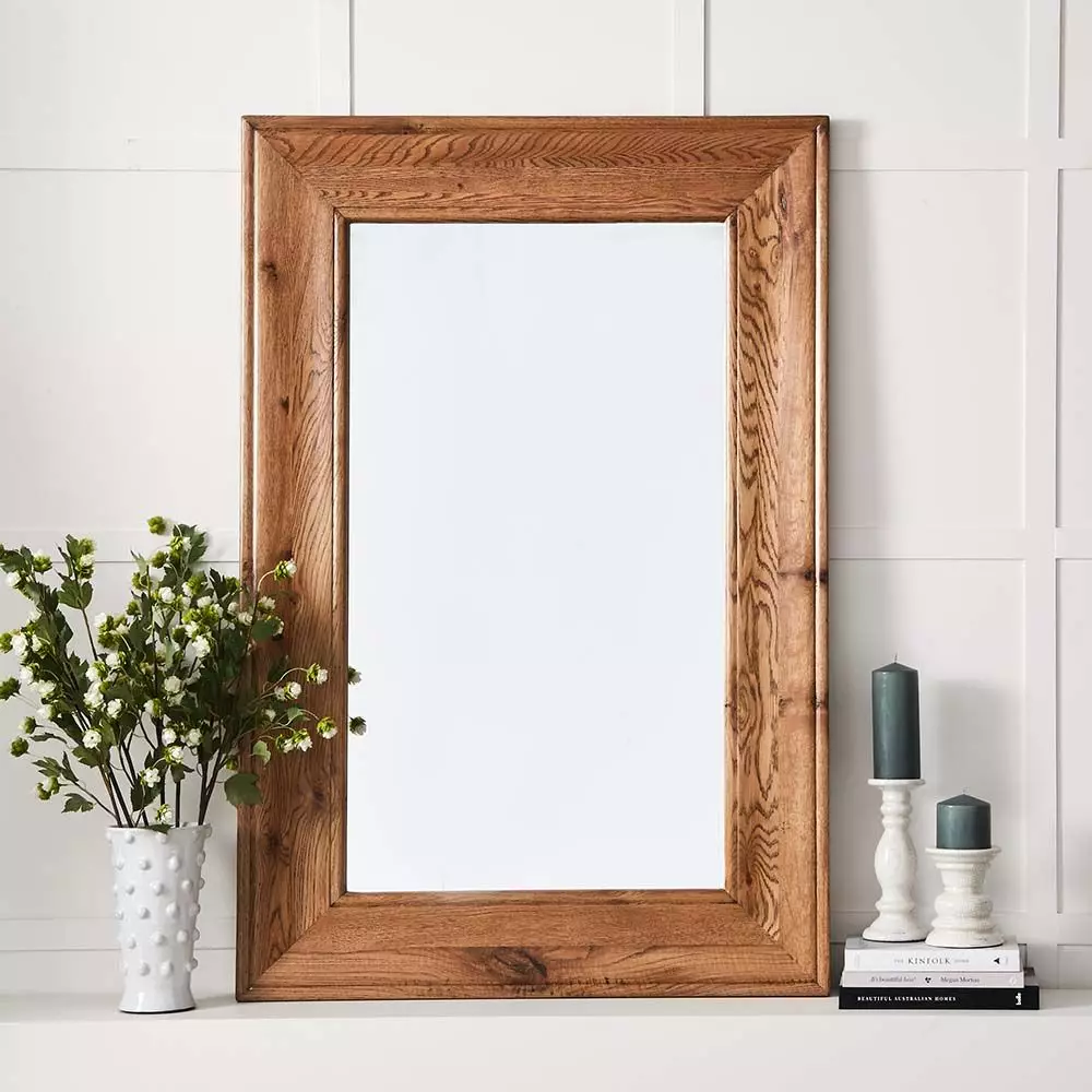 The thick natural oak frames this mirror perfectly. It is sure to look good in any room.
